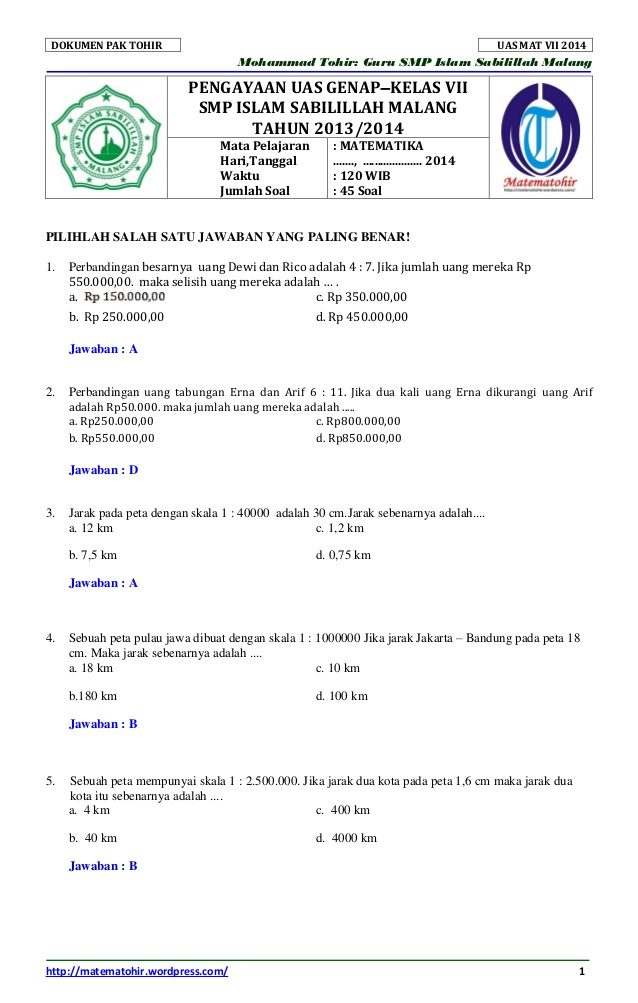 50 Soal Matematika Kelas 7 Semester 2 + Kunci Jawaban PTS dan UTS