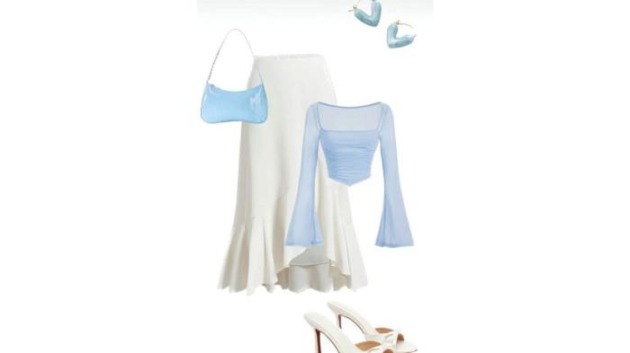 Atasan biru dan bawahan putih memberikan nuansa fresh dan menenangkan. Warna biru muda menghadirkan kesan lembut, sementara putih membuat tampilan terlihat rapi dan bersih. Outfit ini cocok untuk tampilan berbeda dari warna Valentine pada umumnya namun tetap feminin dan elegan.