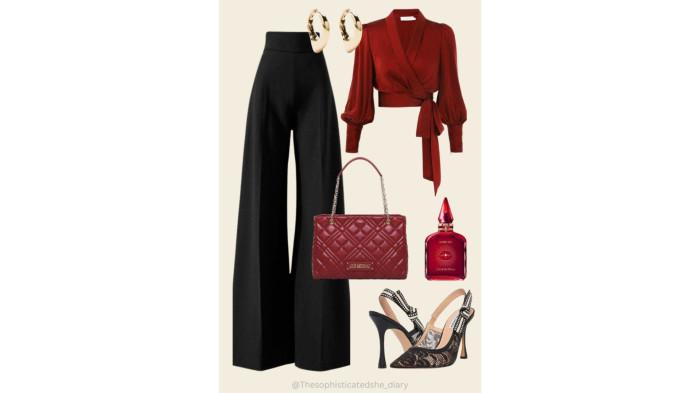 Kombinasi atasan merah dan bawahan hitam menghadirkan kesan elegan dan dewasa. Warna merah menjadi fokus utama yang melambangkan cinta dan keberanian, sementara hitam memberikan kesan tegas dan classy. Atasan merah dapat berupa blouse satin, kemeja, atau knit top. Pilih model yang simpel namun tetap memiliki detail menarik. Untuk bawahan, celana hitam high waist atau rok hitam akan menciptakan siluet yang rapi dan proporsional. Outfit ini cocok untuk acara Valentine yang lebih formal seperti dinner romantis. Tambahkan heels atau sepatu hitam untuk menyempurnakan tampilan.